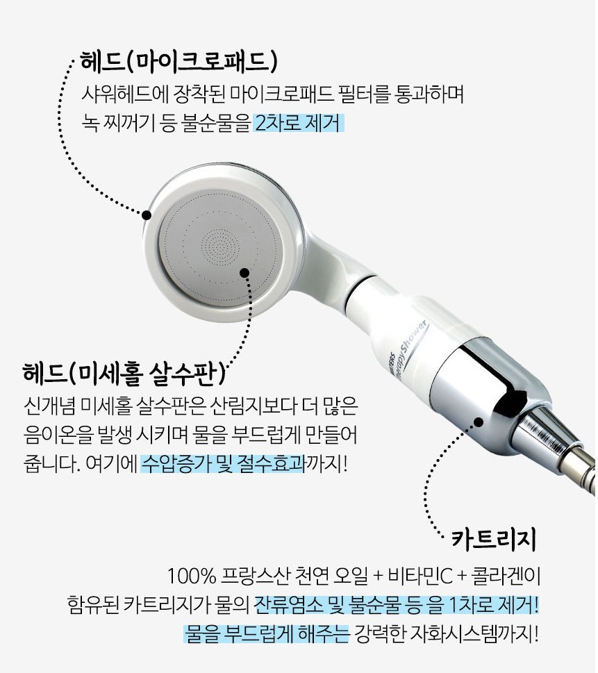 100프로 프랑스산 천연 오일 + 비타민C + 콜라겐까지. 잔류염소 및 불순물을 제거하며 물을 부드럽게하는 강력한 자화기능